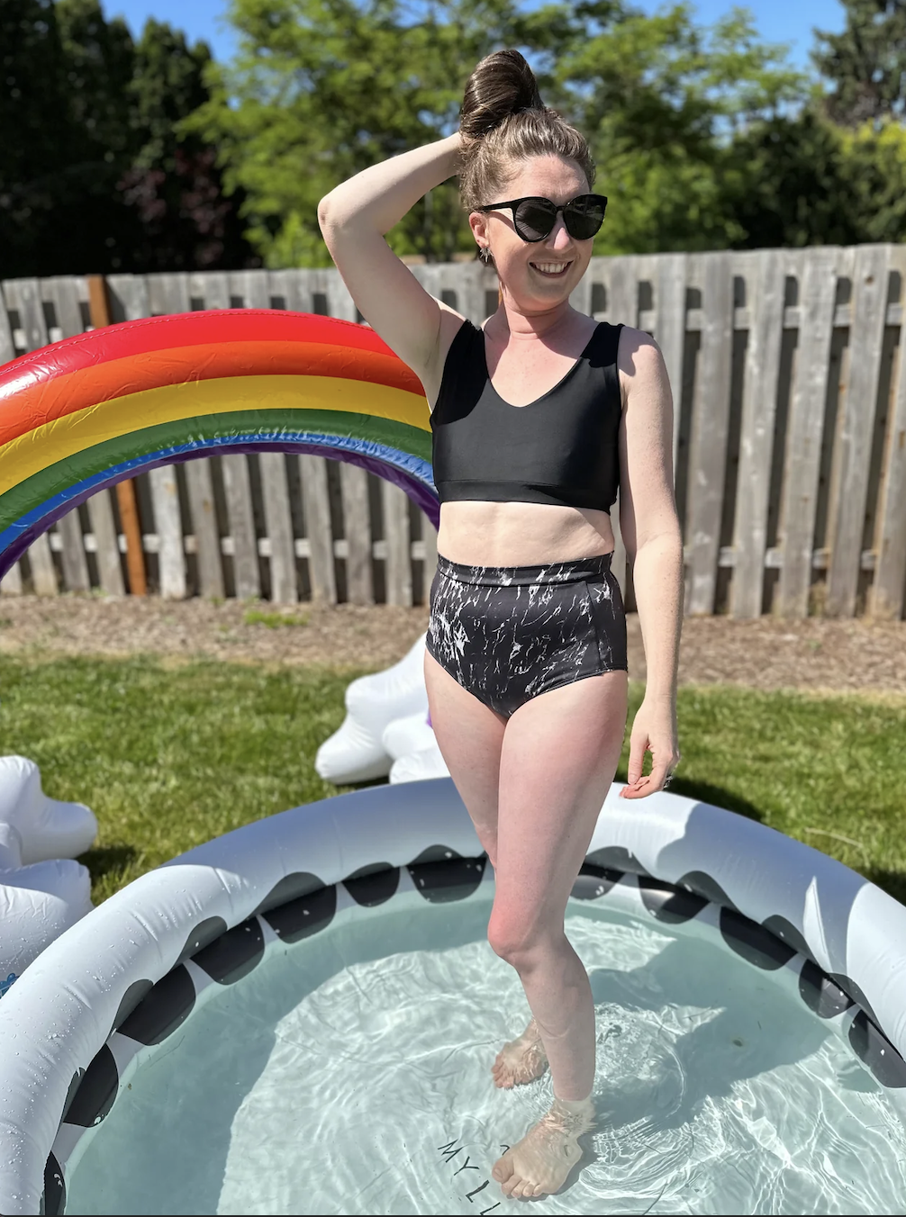 Heather is shown wearing the size 2 top and size 3 brief bottoms.