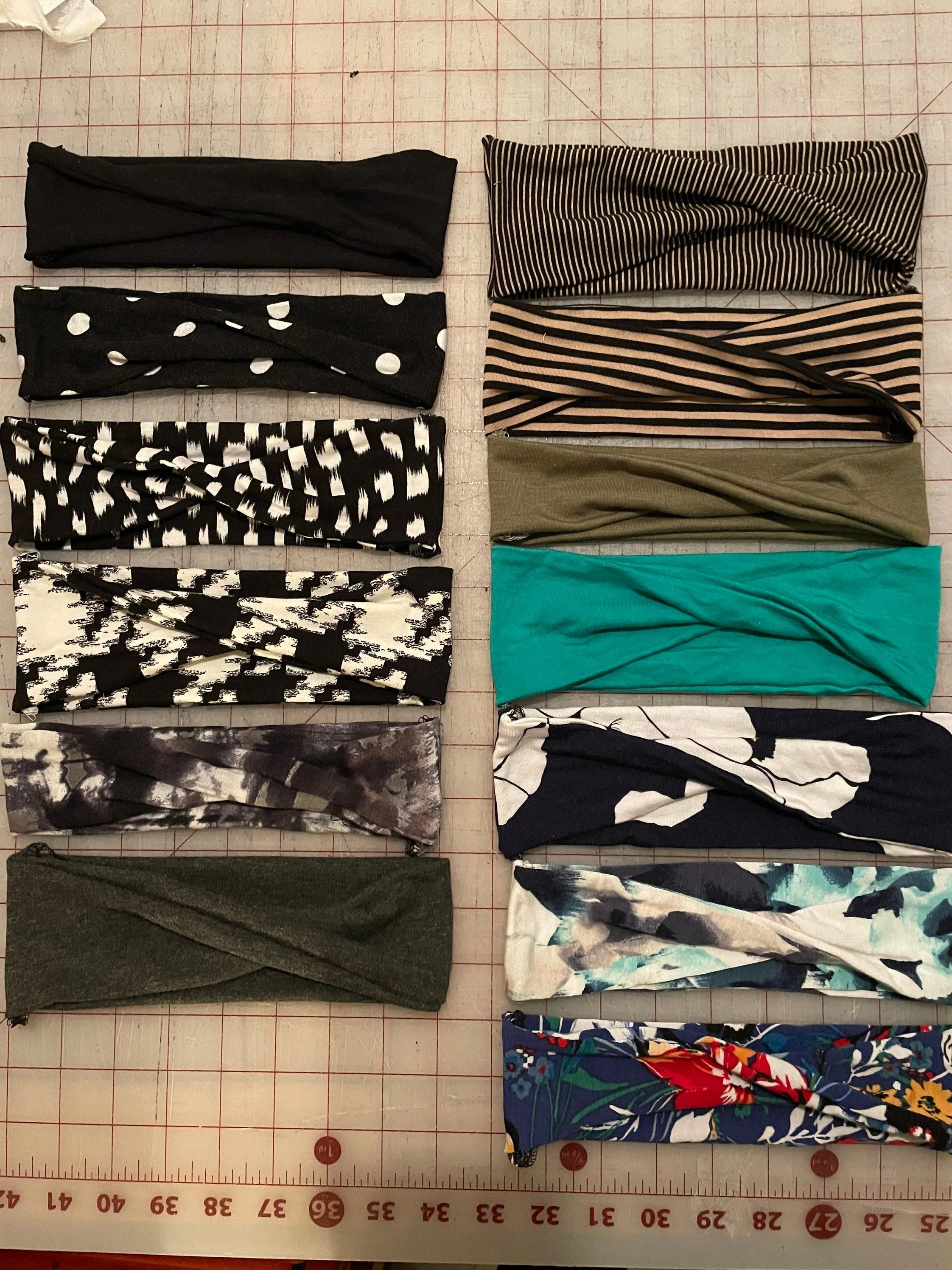 These headbands grew out of a desire to reduce some of the waste from our normal clothing production. They are all made from a variety of super soft knit fabrics mostly of bamboo, rayon, cotton and spandex blends.